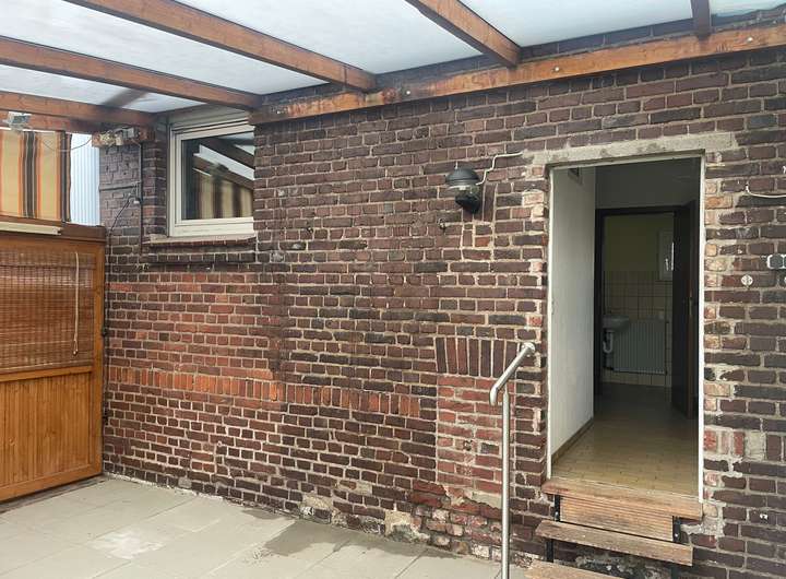 Die an das Haus angrenzende Terrasse ist überdacht. Betonsteinplatten wurden 2021 neu verlegt. Zu dem Haus gehört eine angrenzende Garage und ein Gartengeräteschuppen