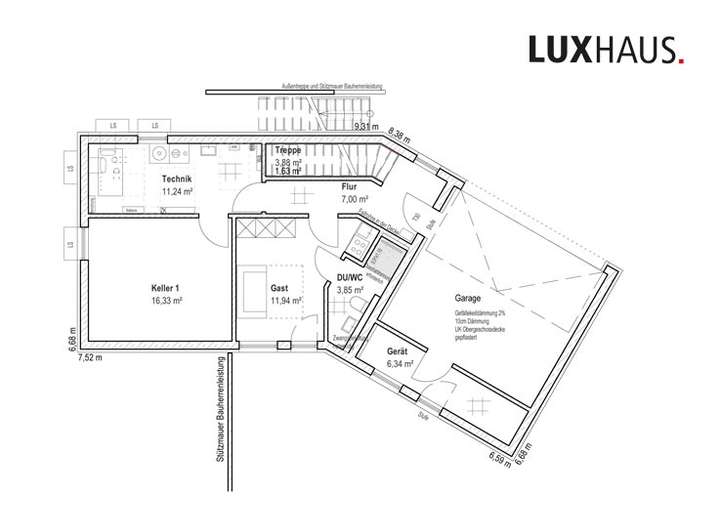 Im Untergeschoss sind neben dem Technikraum noch ein zusätzliches Gästezimmer mit Duschbad, ein weiterer Kellerraum sowie der Zugang zur Garage vorgesehen. Die Flächen und Räume auf dieser Ebene erweitern die Gesamtfläche des Hauses deutlich und bieten vielfältige Nutzungsmöglichkeiten - vom Gästebereich über Hobbyräume bis hin zu Arbeits- oder Wellnesszonen.