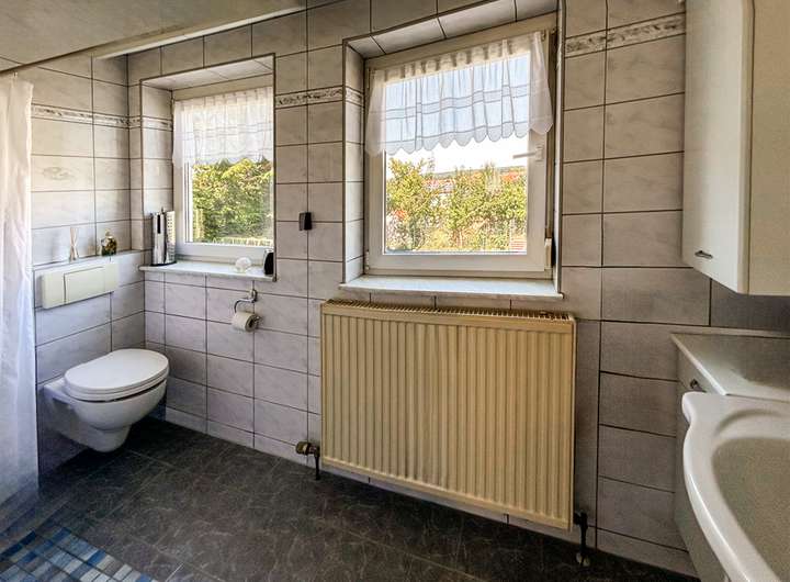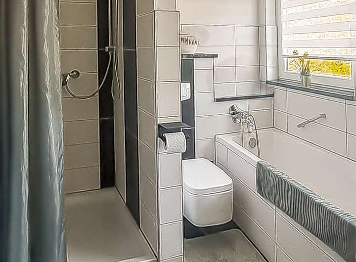Das moderne Badezimmer ist ausgestattet mit Badewanne und zusätzlich mit gemauerter Dusche.
