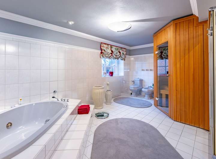 _Großes Badezimmer im Erdgeschoss mit Sauna, Whirlpool, Dusche, zwei Waschbecken und Bidet