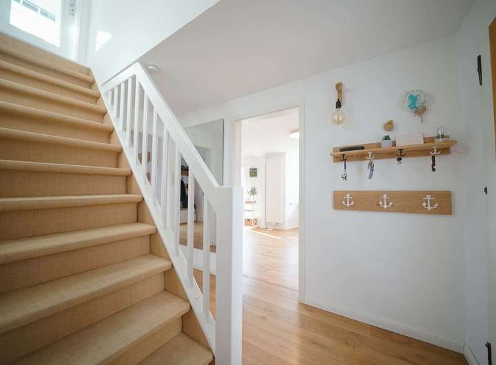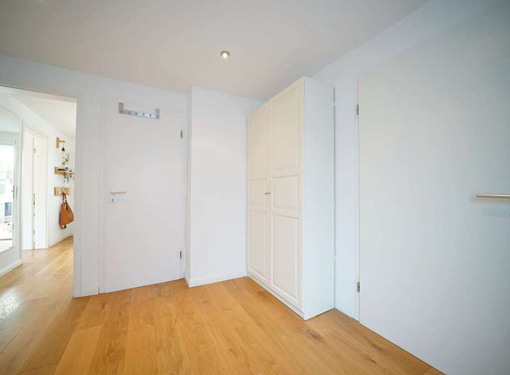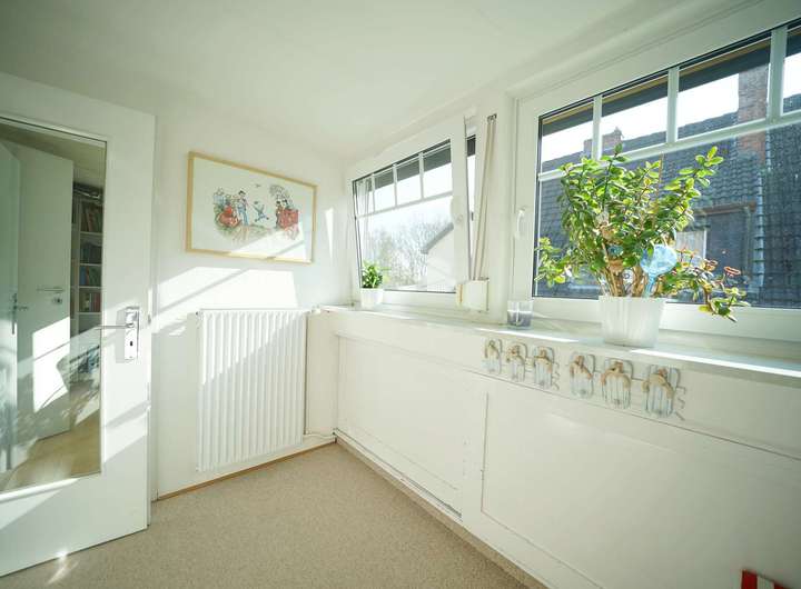 Die Holztreppe mit Sisalteppich führt in das Dachgeschoss. Hier befindet sich rechts das gemütliche Schlafzimmer. Ein kleines WC mit Dachfenster befindet sich neben dem Schlafzimmer. Der Flur bietet Platz für einen Arbeitsbereich. Eine Ankleide mit Einbauschränken unter der Dachschräge sowie ein großes Kinderzimmer mit wunderschönem Blick über den Garten komplettieren das Raumangebot dieser Etage.