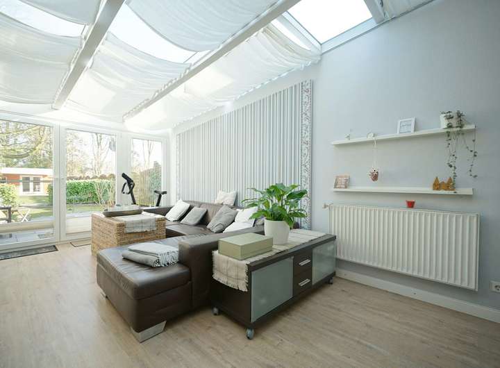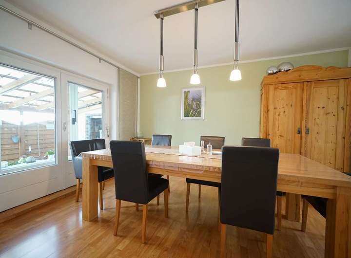 Die angebotene Immobilie ist ein in den 1950er Jahren in Massivbauweise errichtetes Einfamilienhaus in Kattenturm, welches ca. 1992 um einen Anbau ergänzt worden ist. Die Immobilie verfügt über eine Wohn- und Nutzfläche von ca. 190 m², verteilt auf sieben Zimmer. Nach dem Betreten des Hauses befindet sich auf der rechten Seite das gemütliche Wohnzimmer mit Kamin und Blick auf die vordere Terrasse und den Vorgarten. Weiter geht es zu einem großen Garderobenbereich, Veranda sowie einem Tageslichtbad mit Handtuchheizkörper und Wanne. Im hinteren Teil des Hauses befindet sich die helle Einbauküche mit direktem Zugang zum großzügigen Esszimmer und kleiner Arbeitsnische. Von hier gelangt man in den weitläufigen Wohnbereich im Wintergarten mit tollem Blick in den Garten. Durch das Glasdach ist dieser Wohnbereich mit besonders viel Tageslicht und vermittelt ein besonderes Raumgefühl. Ein neuwertiges Badezimmer mit angrenzender Sauna, der Heizungs- und Abstellraum sowie ein helles Gästezimmer vervollständigen das Raumangebot dieser Ebene.