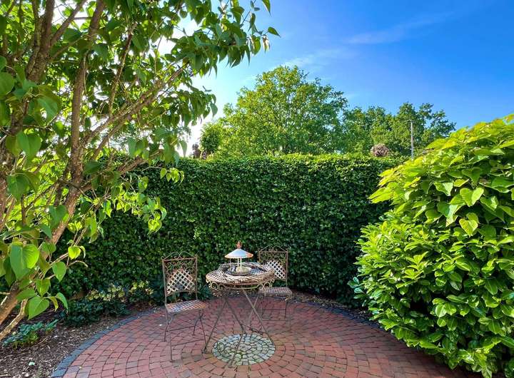 Der vordere Teil des Grundstückes ist mit einer Hecke als Sichtschutz versehen, die vorderen Terrasse hat zusätzlich einen Zaun und Grünbepflanzung für mehr Privatsphäre. Die Auffahrt ist mit einem Carport versehen und angrenzend an die Garage. Ein weiterer Carport und Stellplatz befinden sich an der vorderen Grundstücksgrenze. Der hintere Garten bietet mehrere Terrassenbereiche, einige Abstellschuppen sowie ein größeres Gartenhaus mit großer Sonnenterrasse. Der gesamte Garten ist liebevoll angelegt und besitzt einen gewachsenen Baum- und Strauchbestand. Der Garten bietet zu jeder Tageszeit ein sonnenverwöhntes Plätzchen.