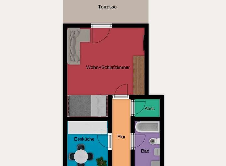 Wohn-/Schlafzimmer, Essküche, Badezimmer, Abstellraum, Flur, Terrasse, Kellerraum