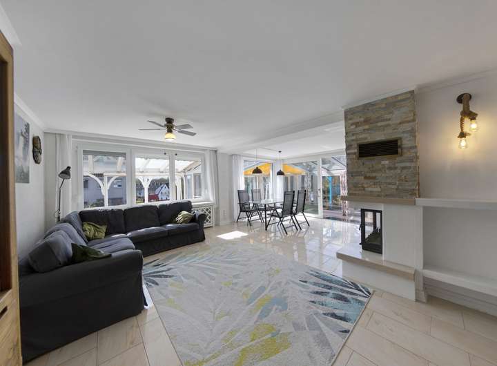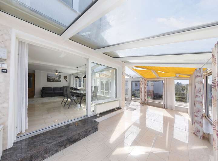 Sieben Zimmer auf drei Ebenen inkl. Gästezimmer, Hobbyraum, Galerie, Arbeitszimmer und großem Schlafzimmer im Dachgeschoss, Großzügiger Wintergarten in L-Form, offen zum Wohnbereich, Zusätzliche Räume im Keller (Hauswirtschaft, Lager, Sauna)