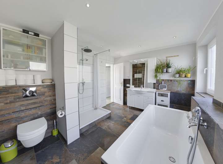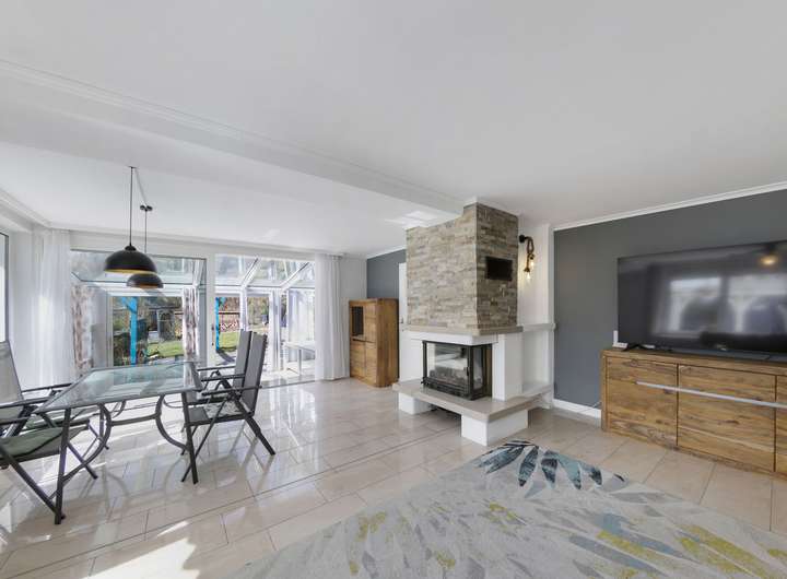 Haustür mit Fingerabdruckfunktion, Italienischer Marmorboden, Kaminofen, beheizter Wintergarten mit elektrischer Markise, gepflegte Einbauküche, Gäste-WC mit Tageslicht, freistehende Badewanne, bodentiefe Dusche, hohe Decken im Dachgeschoss, Sauna, Garten mit Grillofen & Spielbereich