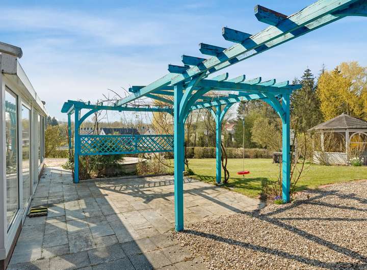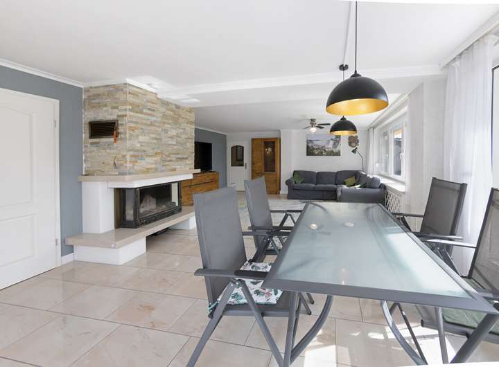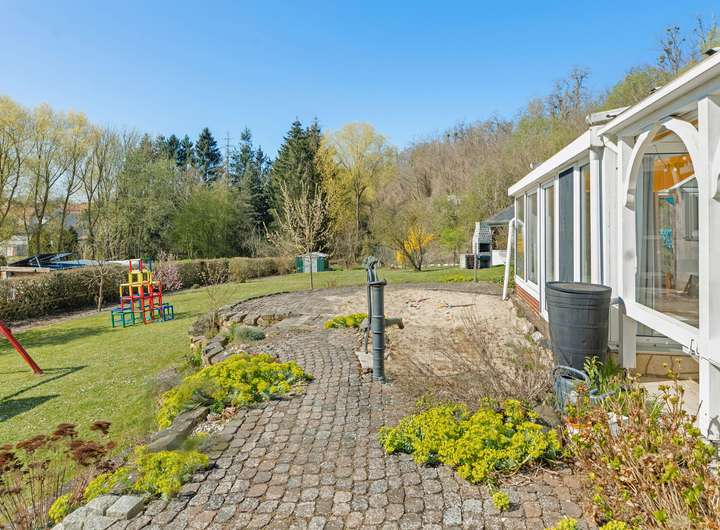 Das Herzstück bildet das großzügige Wohn- und Esszimmer mit Kaminofen und direktem Übergang in den beheizbaren Wintergarten mit italienischem Marmorfußboden. Drei Ausgänge führen in den liebevoll gestalteten Garten mit zwei Terrassen, Sandkasten, Kräuterspirale, Obstbäumen, Brombeerhecke, Weinreben und einem Pavillon – ein echtes Gartenparadies für Groß und Klein.