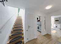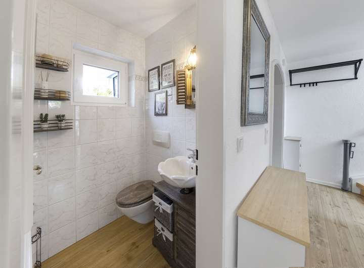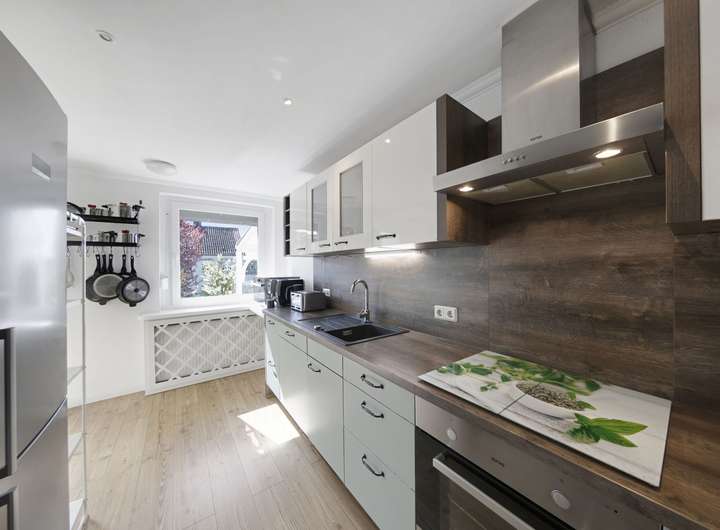 Der Eingangsbereich empfängt Sie mit heller Atmosphäre, modernem Holz-Laminat und einem Gäste-WC mit Tageslicht. Die gepflegte Küche mit hochwertiger Einbauküche und Zugang zur Terrasse wird durch eine praktische Abstellkammer ergänzt – ideal für den Alltag.