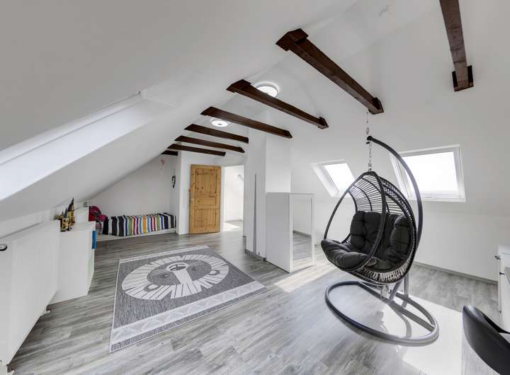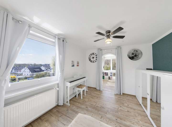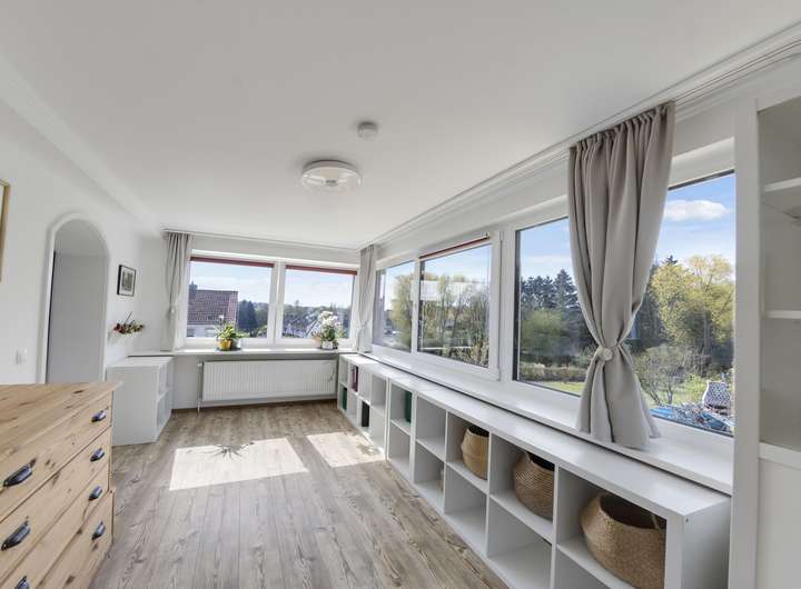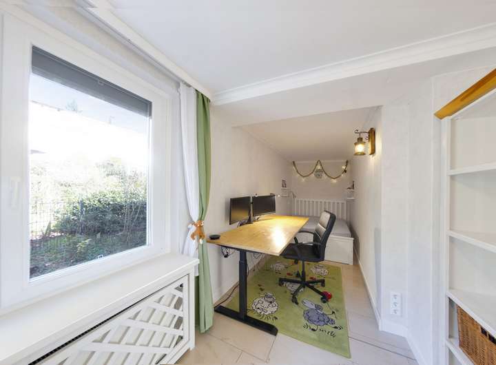 Im Obergeschoss erwarten Sie eine helle Diele, ein Ankleidezimmer, ein Arbeitszimmer mit Blick ins Grüne, ein Schlafzimmer sowie ein stilvolles Bad mit freistehender Wanne und offener Dusche. Im Dachgeschoss befindet sich ein luftiges, großes Zimmer – aktuell als Kinderzimmer genutzt.
