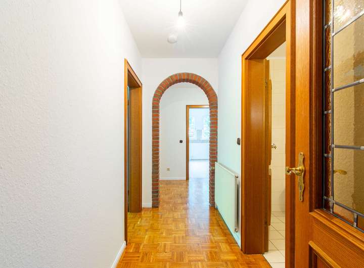 Bereits beim Betreten der Wohnung empfängt Sie ein einladener Flur, von dem aus alle Räume bequem erreichbar sind: die separate Küche, zwei Schlafzimmer, das Badezimmer sowie das großzügige Wohnzimmer mit abgrenzendem Essbereich. Eine praktische Abstellfläche im Flur bietet zusätzlichen Stauraum und sorgt für Ordnung im Alltag.