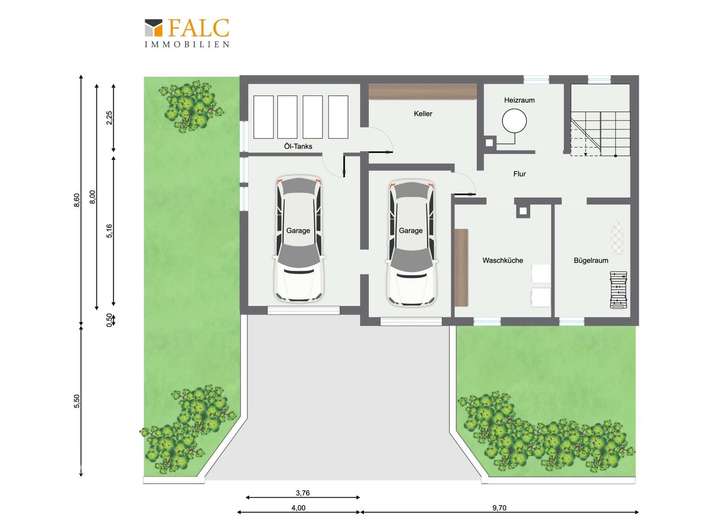 Das Wohnhaus verfügt über zwei Einzelgaragen sowie Platz für 3 weitere PKWs vor und neben dem Haus.
