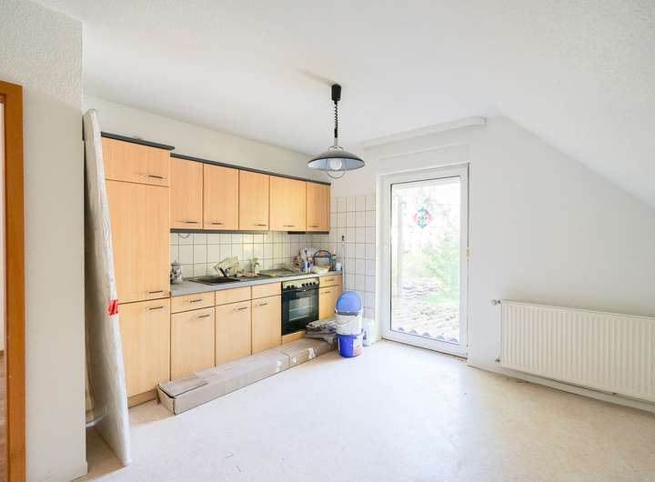 Die Wohneinheit im Erdgeschoss umfasst drei gut geschnittene Zimmer, die flexibel als Schlaf-, Wohn-, Kinder- oder Arbeitsräume genutzt werden können. Die separate Küche bietet ausreichend Platz für eine gemütliche Essecke und lädt zum gemeinsamen Kochen ein. Das Tageslichtbad ist funktional ausgestattet. Ein zusätzlicher Abstellraum unter der Treppe bietet praktischen Stauraum für Vorräte oder Haushaltsgeräte.