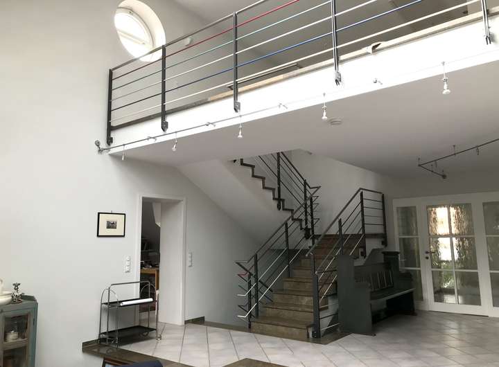 Über die offene Galerie im Obergeschoss, die dank eines großen Dachfensters viel Tageslicht ins Haus bringt, erreicht man das komfortable Schlafzimmer mit Einbauschränken, ein Tageslichtbad mit Badewanne, ein weiteres Bad mit Dusche sowie einen flexibel nutzbaren Raum.