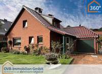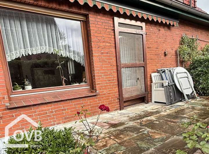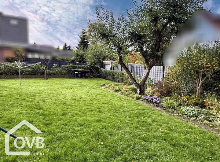 Ein Nebengebäude, das über den Windfang direkt mit dem Haus verbunden ist, bietet Platz für Abstellflächen, Vorräte und Garage – praktisch, gerade bei norddeutschem Wetter. Der Garten ist pflegeleicht mit Rasen, Zierbeeten und altem Baumbestand angelegt.