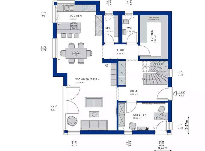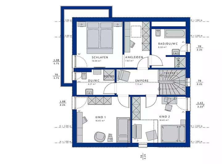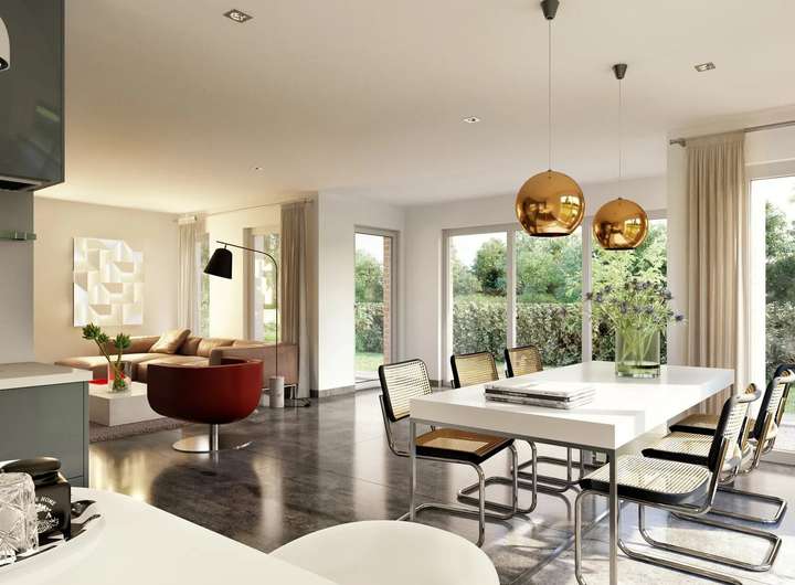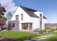 Wer nicht jedem Trend blind hinterherlaufen möchte, für den ist vielleicht dieses zeitlos schöne Fertighaus die perfekte Lösung. Mit seinem bewährten Satteldach, das ideale Voraussetzungen für die Installation einer Photovoltaik- oder einer Solarthermie-Anlage bietet, passt sich das Gebäude perfekt in jedes Baugebiet ein. Eine persönliche Note können Bauherren ihrem Traumhaus mit verschiedenen Architektur-Bauteilen verleihen. Bei diesem Planungsbeispiel wird die Wohnfläche durch einen Übereck-Erker sowie einen Zwerchgiebel mit Flachdach erweitert. Für Spannung sorgt dabei nicht nur die asymmetrische Anordnung, sondern auch die Farbgestaltung: Die grau abgesetzten Fassadenbereiche kontrastieren mit dem weißen Mineralputz auf attraktive Weise. Während sich das Haus straßenseitig eher geschlossen mit kleineren Lichtöffnungen präsentiert, öffnet es sich zum Garten hin mit großzügigen Verglasungen. Ein schöner Blickfang sind die Fensterrahmen aus Holz, die sich charmant in das Gesamtbild einfügen. Das Hausinnere bietet auf einer Wohnfläche von mehr als 170 m² einen großen Gestaltungsspielraum für seine zukünftigen Bewohner. Die Aufteilung des Grundrisses wurde auf den Alltag einer vierköpfigen Familie abgestimmt. Rechts der Diele befinden sich die Funktionsräume, bestehend aus einem Technikraum, einem Gäste-WC und einer geräumigen Speisekammer. Links der Diele liegt ein großes Homeoffice - nah bei der Familie, aber dennoch abgeschirmt vom Alltagsgeschehen. Gartenseitig erstreckt sich der weitläufige Wohn-, Ess- und Kochbereich, der dank der bodentiefen Glasflächen mit Tageslicht geflutet wird. Über eine zweiflügelige Balkontür gelangt man auf die Terrasse, die im Sommer zum zweiten Wohnzimmer wird. Das Dachgeschoss steht dem Erdgeschoss in puncto Wohnkomfort in nichts nach. Jede Generation hat hier ihren eigenen Bereich. Für die Kinder stehen zwei gleich große Kinderzimmer zur Verfügung. So werden Streitigkeiten schon von vornherein vermieden. Der Nachwuchs kann sich zudem über ein eigenes Kinderbad mit Dusche freuen. Das Reich der Eltern umfasst ein luftiges Schlafzimmer, eine sehr geräumige Ankleide und ein Wellnessbad mit Dusche und Wanne.