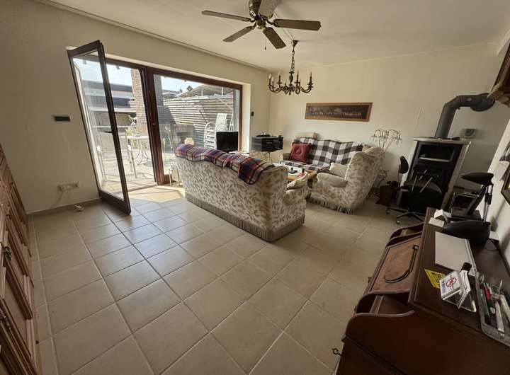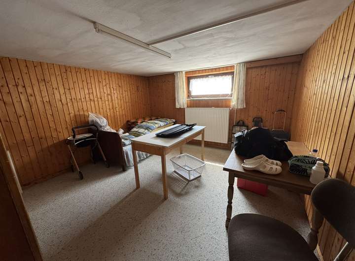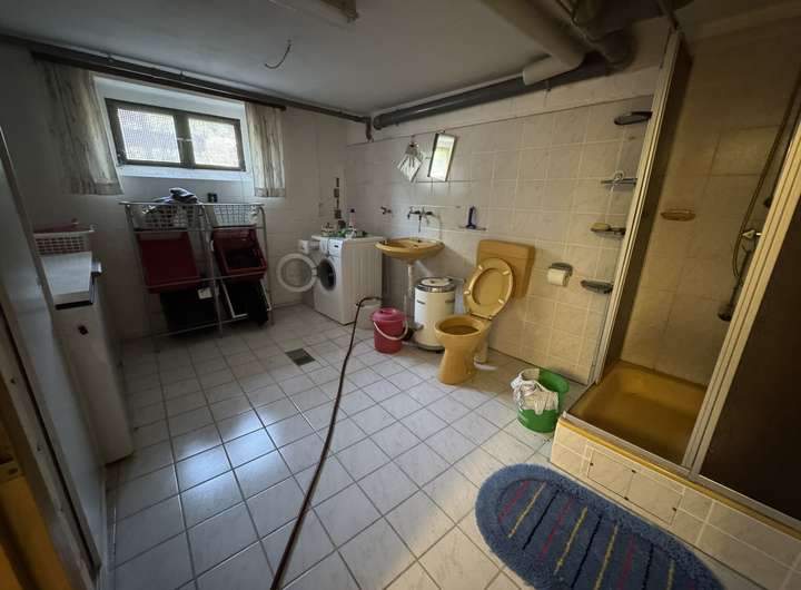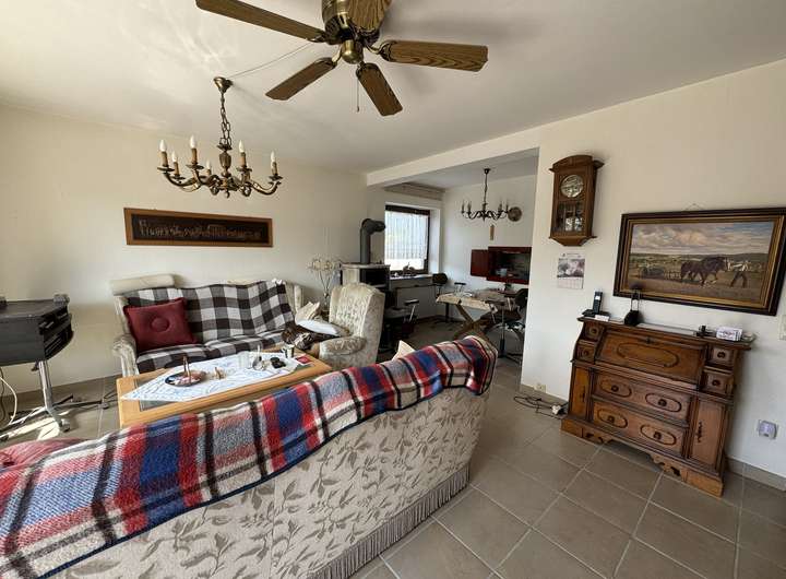 Im Erdgeschoss befindet sich ein großzügiges, helles Wohnzimmer mit Kaminofen und Zugang zur Terrasse, eine gemütliche Küche, ein Bad mit Wanne sowie drei weitere Zimmer, die sich ideal als Schlafzimmer oder Büro eignen.