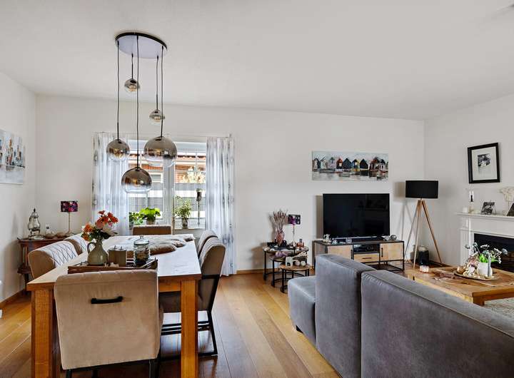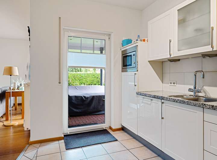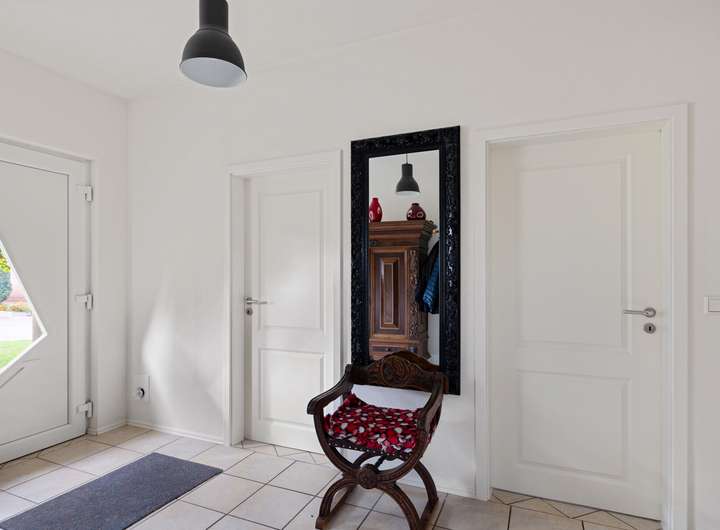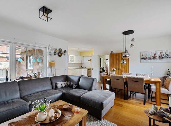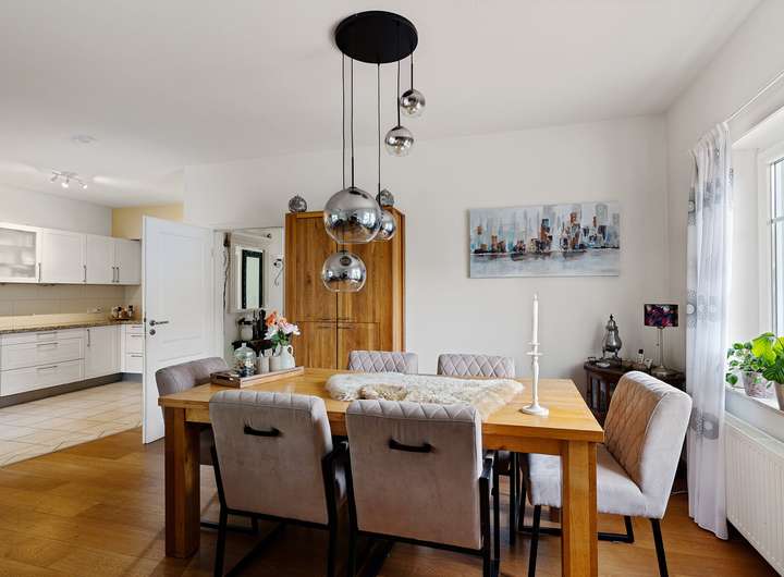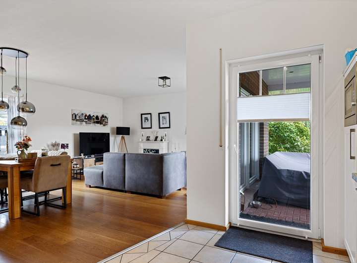 Beim Betreten des Hauses gelangen Sie in einen einladenden Eingangsbereich, der Sie direkt in den offenen Wohn- und Essbereich führt. Hier sorgen große Fenster für viel Tageslicht, und der Zugang zur Terrasse schafft ein angenehmes Wohngefühl mit viel Platz. Die offene Küche ist modern ausgestattet und bietet alles, was das Herz begehrt.
