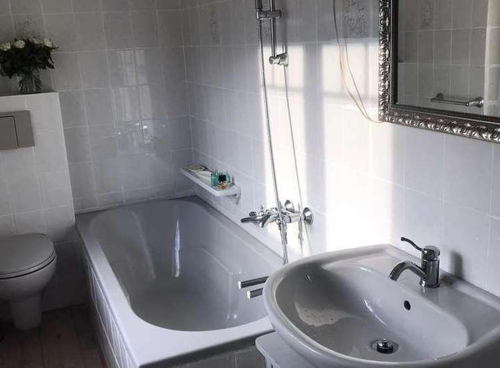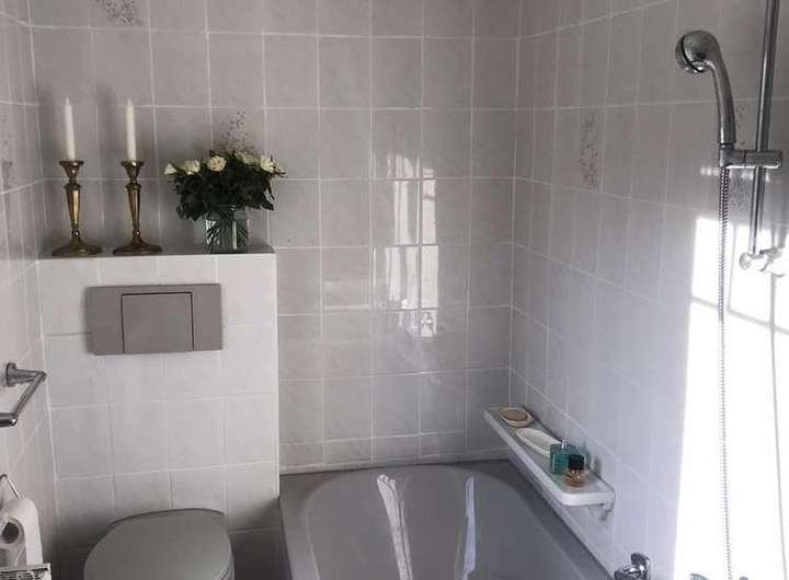 sowie ein praktisches Gäste-WC mit Dusche und Fenster.
