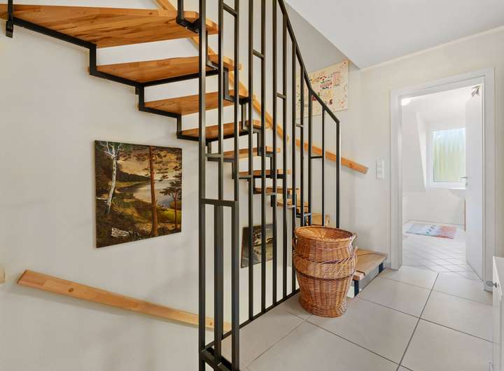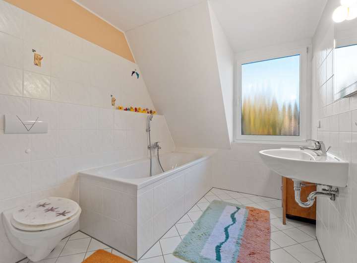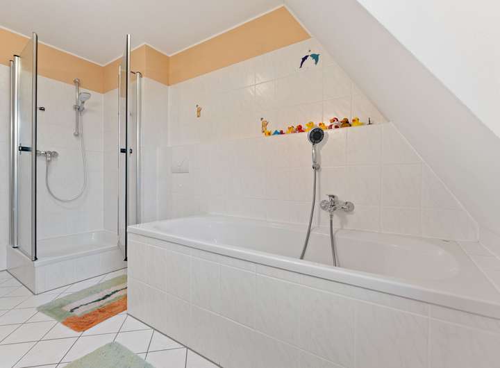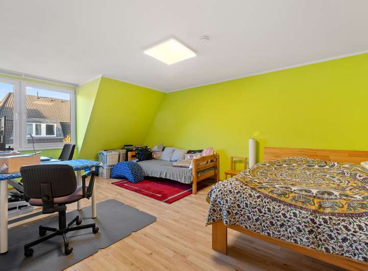 Im Obergeschoss befinden sich drei gut geschnittene Schlafzimmer sowie ein großes Badezimmer mit Dusche. Das Dachgeschoss wurde zu einem weiteren Schlafraum ausgebaut und bietet zusätzlichen Platz – ideal als Gästezimmer oder Homeoffice.