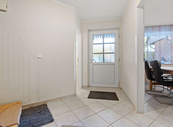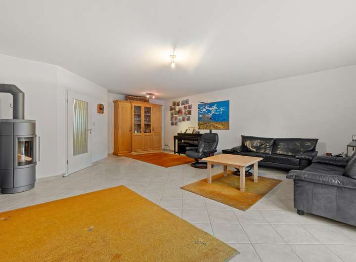 Das Erdgeschoss empfängt Sie mit einem einladenden Flur, einer Küche und einem großzügigen Wohnbereich mit Zugang zur Terrasse und dem gepflegten Garten. Der im Wohnbereich installierte Speckstein-Kaminofen lädt zu gemütlichen, gemeinsamen Wohlfühlmomenten ein und sorgt in der kalten Jahreszeit für eine besonders behagliche Atmosphäre. Die Terrasse ist mit einer Markise ausgestattet und bietet Raum für entspannte Stunden im Freien.