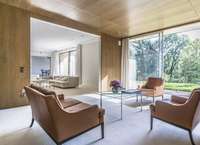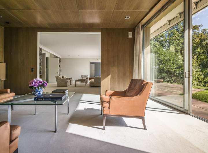 Das Haus trägt die typischen Charakteristika einer klassischen Mid-Century-Immobilie: offene Grundrisse, großzügige Fensterflächen, natürliche Materialien, funktionale Klarheit und ein harmonisches Zusammenspiel mit der umgebenden Natur. Die architektonische Gestaltung ist geprägt von Ruhe, Struktur und einem stilsicheren Umgang mit Raum und Proportion.