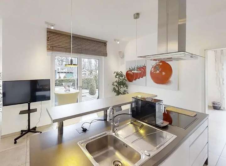 Besonders das Erdgeschoss überzeugt durch eine großzügige Fensterfront, die den Wohnbereich mit natürlichem Licht durchflutet und eine warme, einladende Atmosphäre schafft. Hier verbinden sich Funktionalität, Komfort und modernes Wohnen zu einem harmonischen Ganzen.
