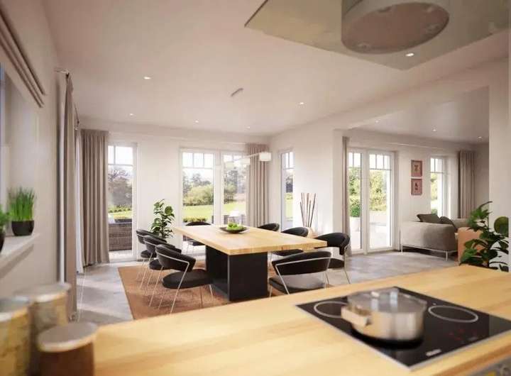 Das CLOU 135 mit Walmdach erinnert an die großzügigen Stadtvillen in den Dörfern und Städten am Mittelmeer. Küche und Essbereich werden mit einem modernen Living-Space ergänzt. Vom Wohnzimmer aus geht es direkt auf die überdachte Terrasse, die bei jedem Wetter eine Wohlfühloase ist. Zwei geräumige Kinderzimmer, ein Familienbad und das Elternschlafzimmer mit integrierter Ankleide finden im Obergeschoss ihren Platz. Genießen Sie von dem großzügigen Balkon den Blick auf Ihren Garten!