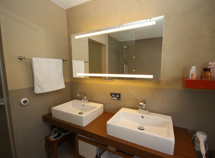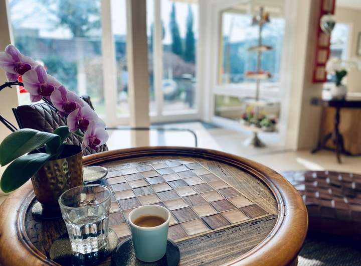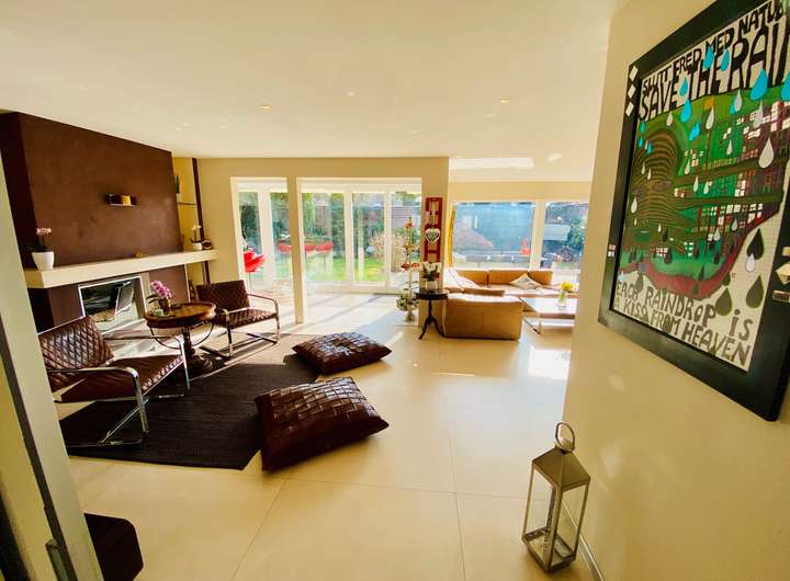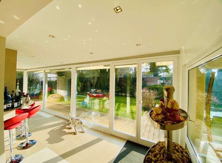 Das fußbodenbeheizte Erdgeschoss (neu raumindividuell und per App steuerbar) wurde mit 1x1 m großen fugenlosen italienischen Designer-Fließen ausgestattet. Im Sommer sorgen 2 individuell einstellbare Klimaanlagen für die nötige Kühlung. Die neue Küche (mit allem ausgestattet, was Freude macht) mündet in den offenen Essbereich und offenen Wohnsalon. Daran grenzt ebenso offen das Kaminzimmer und der große Wintergarten mit der Hausbar an. Ob vom Esstisch oder vom Kaminsessel, durch die komplette bodentiefe Fensterfront hat man von überall eine wunderschöne Aussicht auf den Garten. Ebenso im Erdgeschoss ist die Eltern-Suite mit großem, begehbarem Kleiderschrank & En-suite Bad mit getrennter Badewanne und Regendusche. Vom Bett aus hat man einen wunderschönen Blick in den Garten. Der große begehbare Kleiderschrank könnte natürlich auch als zusätzliches Schlafzimmer genutzt werden. Neue Fenster mit elektrischen bzw. App-gesteuerten Rollläden, Wände mit spezieller Verarbeitungstechnik (venezianischer Stuck bzw. Leder-Elementen) und speziellen Glas-Türen runden das luxuriöse Lebensgefühl ab.