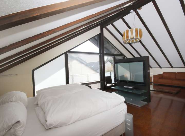 Das Obergeschoss mit Sichtdachstuhl erreicht man über die offene, mit Spots beleuchtete Treppe. Von der luxusparkettierten Galerie mit Leseplatz gehen zwei sehr große Zimmer, ein kleines Zimmer und ein Badezimmer ab. Das kleine Zimmer wird derzeit als begehbarer Schrank genutzt, könnte aber als Zimmer bzw. kleine Küche genutzt werden. Die großen Zimmer haben über 30qm. Ein Zimmer hat einen Rolls Royce Boden mit Sonnen Loggia. Beide großen Räume werden im Sommer durch individuell einstellbare Klimaanlagen gekühlt.
