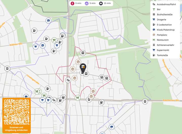 Für Sportbegeisterte ist die Nähe zu verschiedenen Sportstätten ein großer Vorteil. Der Sharky Sports Club ist nur etwa 1km Meter entfernt und bietet vielfältige Möglichkeiten zur sportlichen Betätigung. Auch der Cologne Cardinals Sports-Club e.V. ist in etwa 1,2km Metern erreichbar und bietet ein breites Angebot an sportlichen Aktivitäten. Fitnessliebhaber kommen ebenfalls auf ihre Kosten: Das beliebte Fitnessstudio FitX ist nur etwa 950 Meter entfernt und bietet moderne Trainingsgeräte sowie vielfältige Kurse für jedes Fitnesslevel.
