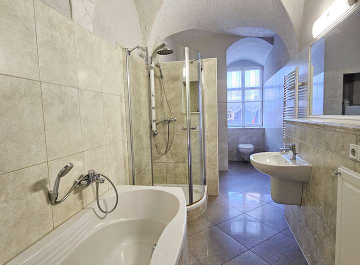 3-Raum-Wohnung angemietet werden. Die Einheit befindet sich im 1. Obergeschoss des Wohn- und Geschäftshauses und bietet Ihnen das einmalige Flair des liebevoll und hochwertig gestalteten Denkmalsobjektes in Verbindung mit modernem Wohnkomfort.