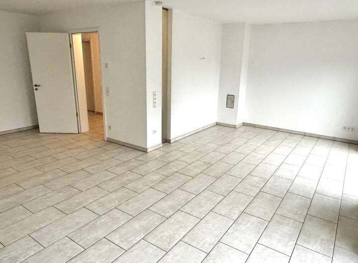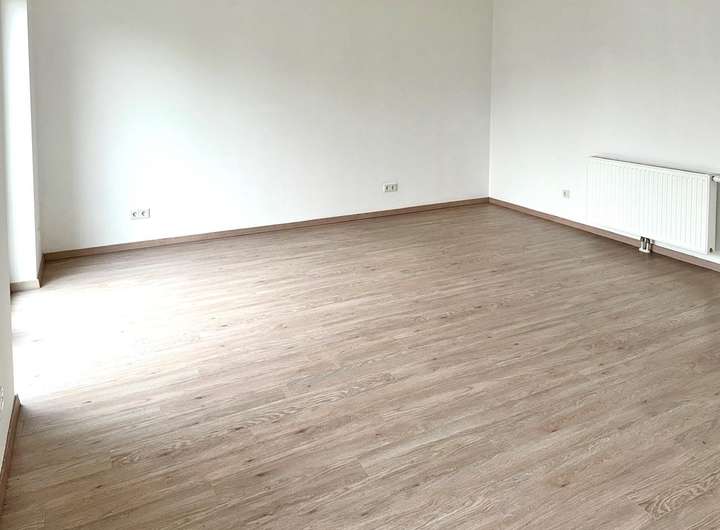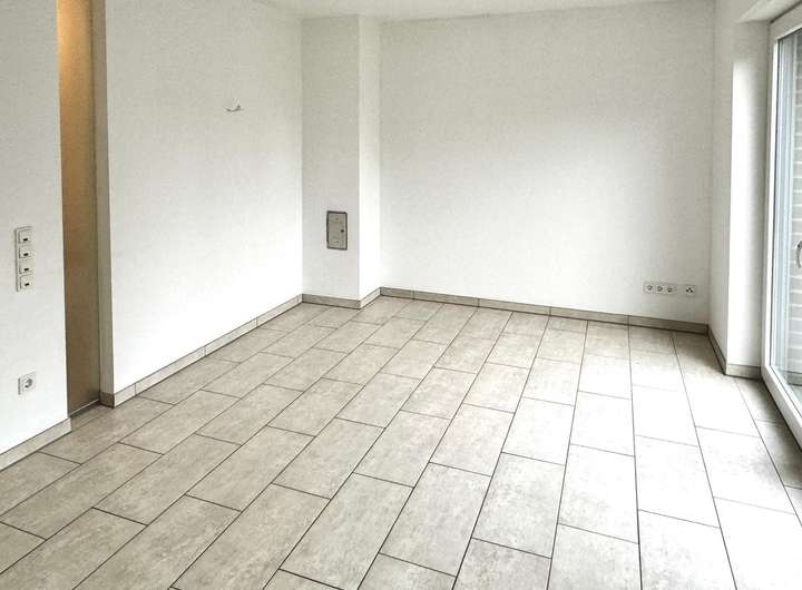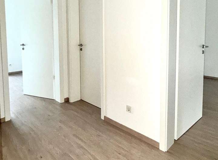 Die Wohnräume sind mit glatten Vliestapeten tapeziert und weiß gestrichen.