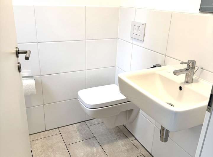 Im Erdgeschoss befindet sich neben dem Hausflur/Eingangsbereich ein Gäste-WC mit Fenster, ein Abstell-/Technikraum sowie eine großzügige Küche und das Wohnzimmer mit Essbereich.