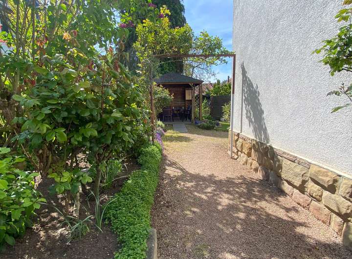 Zu den Highlights zählen ein gepflegter Garten mit stilvollem Pavillon, eine Fassade, die frisch gestrichen wird sowie eine repräsentative Eingangstür aus massivem Echtholz. Diese Details unterstreichen den besonderen Charakter des Hauses und machen das Wohnen zu einem echten Erlebnis.