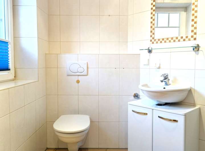 Ein hell gefliestes Gäste-WC mit Dusche komplettieren das Raumangebot in der unteren Etage.