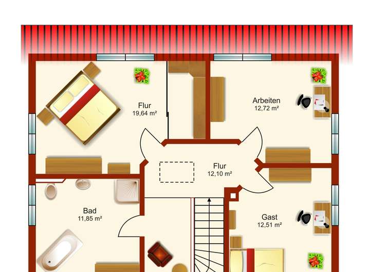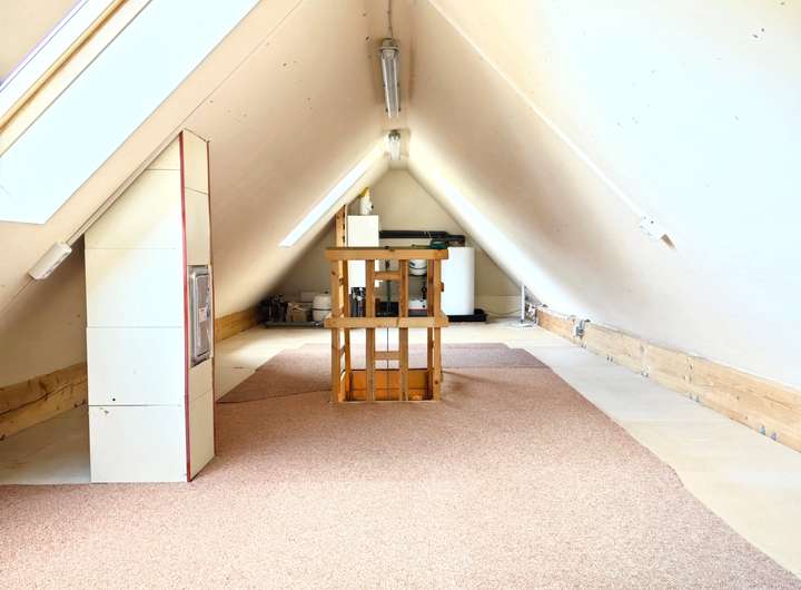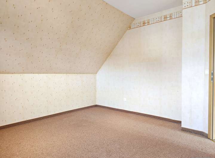 Im Obergeschoss trennt ein zentraler Flur die Wohnräume. Von hier führt eine Ausziehtreppe zum Spitzboden, der als zusätzlicher Stauraum genutzt werden kann. Dort ist auch die Heizungsanlage beherbergt. Zwei nahezu identisch geschnittene Kinderzimmer bieten Platz für Bett, Schreibtisch und Kleiderschrank. Das Elternschlafzimmer ist großzügig gestaltet und verfügt über einen abgetrennten Ankleidebereich – perfekt für zusätzlichen Stauraum.