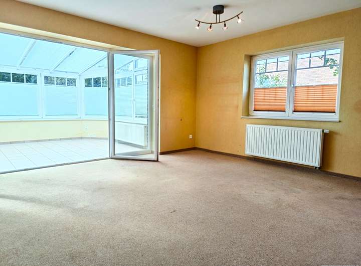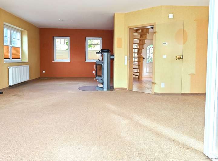 Das lichtdurchflutete Wohnzimmer erstreckt sich über fast 40 m² und schafft eine warme, offene Atmosphäre. Großzügige Fensterfronten sorgen für viel Tageslicht, während der Kamin an kalten Tagen gemütliche Stunden garantiert. Über bodentiefe Türelemente gelangen Sie in den beheizten Wintergarten, der dank seiner Fußbodenheizung auch im Winter ein wunderbarer Ort zum Entspannen ist. Von hier aus haben Sie Zugang in den kleinen aber sonnigen Südgarten.