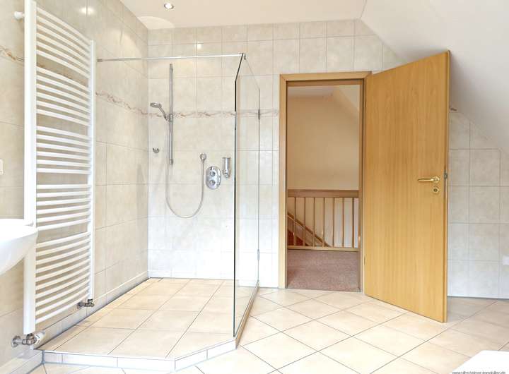 Ein besonderes Highlight ist das geräumige Tageslichtbad mit Dusche, Badewanne, WC und Waschtisch. Helle Fliesen und eine geschickte Raumaufteilung schaffen hier ein modernes und zugleich behagliches Ambiente.
