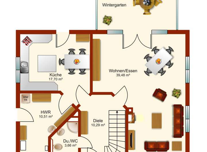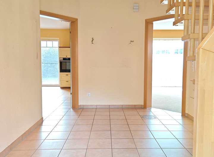 Über den einladenden Eingangsbereich betreten Sie das Haus. Der Flur ist sehr großzügig geschnitten und bietet Platz für Garderobe und Schuhschrank. Von hier aus erreichen Sie alle Räume im Erdgeschoss sowie die stilvolle Holztreppe, die mit Spotlichtern akzentuiert ist und ins Obergeschoss führt.
