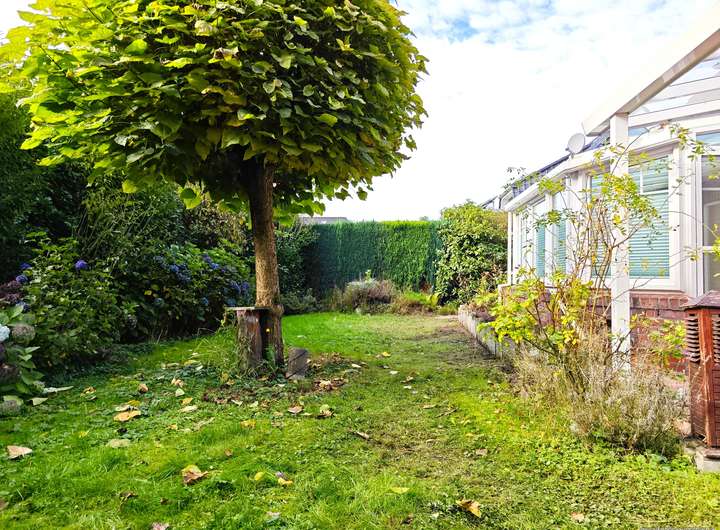 Der Garten ist pflegeleicht angelegt und bietet vielfältige Rückzugsorte. Die große, überdachte Terrasse lädt zu Grillabenden mit Familie und Freunden ein, während zwei kleinere Sitzbereiche am Ende des Gartens naturnahes Entspannen ermöglichen. Das gepflasterte Gewächshaus lässt sich flexibel nutzen, und der gemauerte Schuppen bietet reichlich Stauraum für Gartengeräte und Fahrräder. Ein massives Carport rundet das Immobilienangebot perfekt ab.
