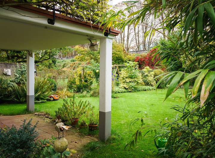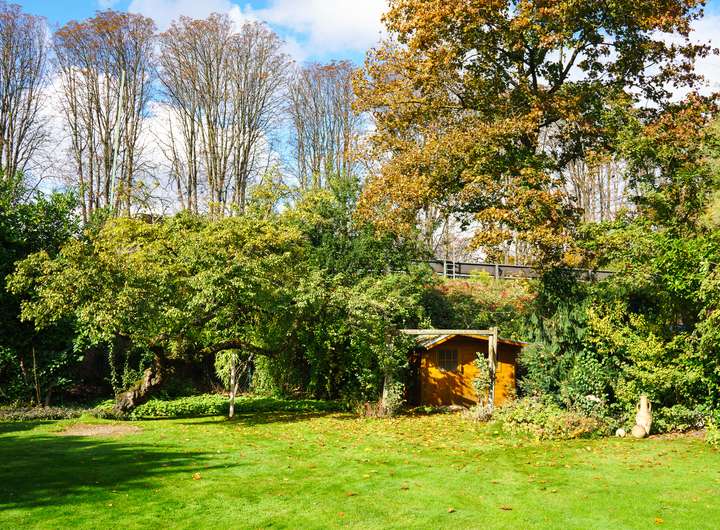 Der Garten ist mit einem zementierten Grillplatz angelegt sowie einem Gartenhaus bebaut.