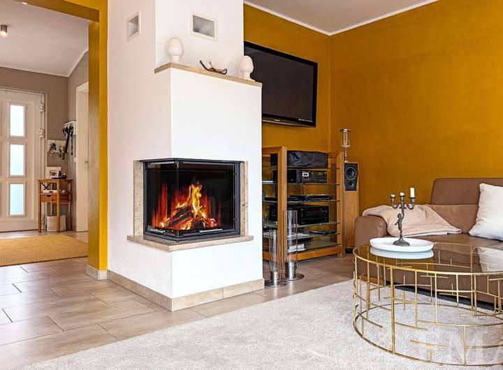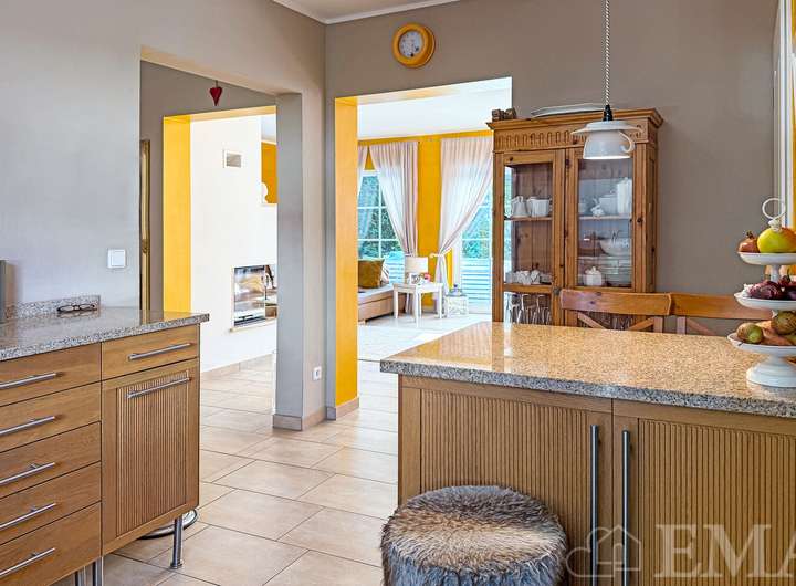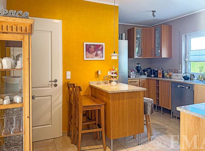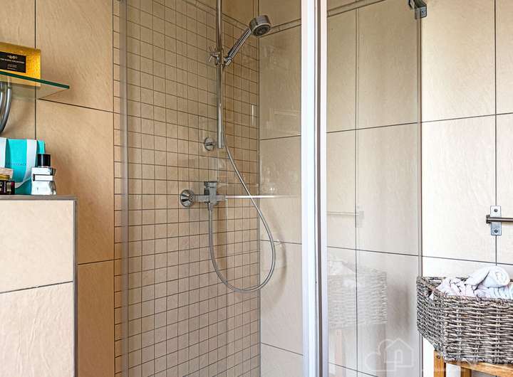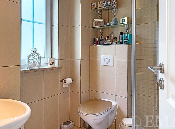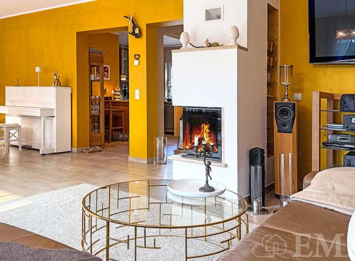 Im Erdgeschoss befinden sich ein großes und lichtdurchflutetes Wohn- und Esszimmer mit dekorativem Kamin und Zugang zur Terrasse, eine geräumige Küche mit moderner Einbauküche und Markengeräten, ein schönes Duschbad sowie eine große Hauseingangsdiele mit eingebauter Garderobe. In der Diele führt eine Massivholztreppe in das Dachgeschoss und in den Vollkeller. Die Wohnfläche im Erdgeschoss beträgt ca. 63 m².