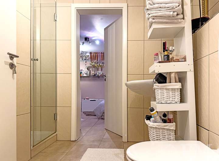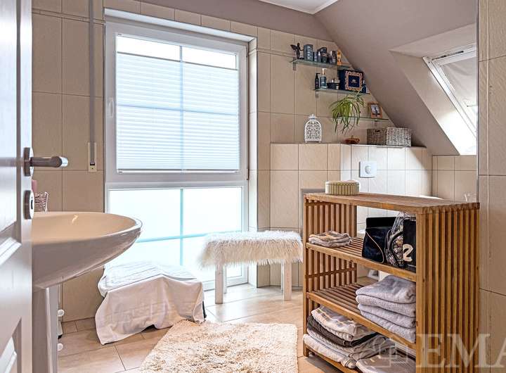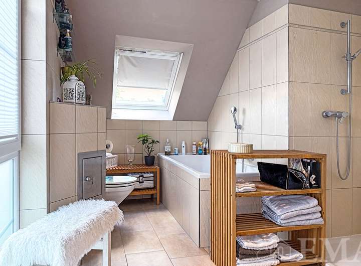 - Badezimmer im Dachgeschoss mit Badewanne und Dusche
