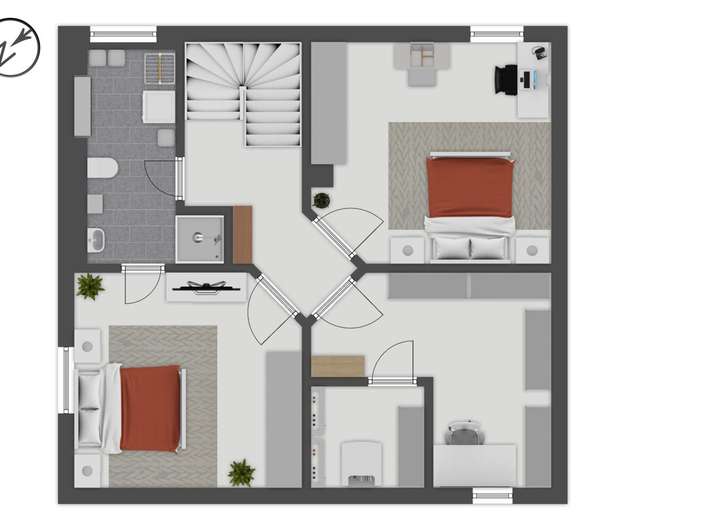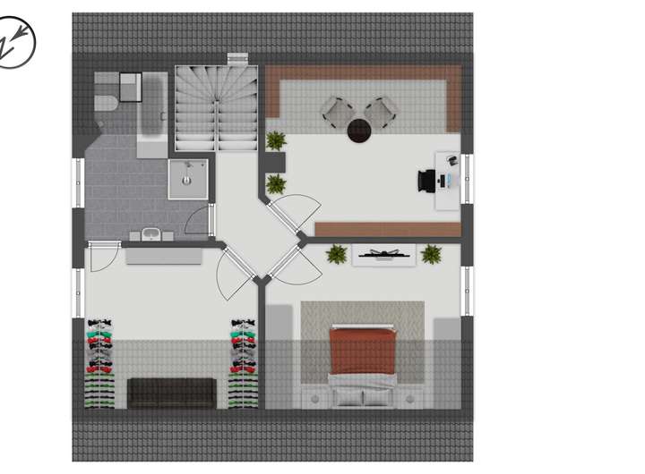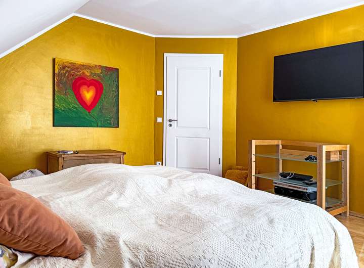 Im Dachgeschoss befinden sich ein großes Zimmer mit separatem Zugang zum Badezimmer mit Badewanne und Dusche, zwei weitere große Zimmer sowie ein Flur. Im Flur befindet sich eine Bodenluke mit Treppenleiter als Zugang zum Spitzboden. Die Wohnfläche im Dachgeschoss beträgt ca. 58 m².