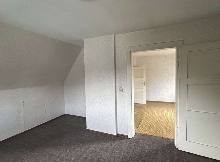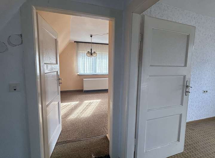 Über die Treppe gelangen Sie in das Obergeschoss mit einer Fläche von ca. 45 m², wo drei weitere Räume zur Verfügung stehen. Diese lassen sich flexibel als Kinderzimmer, Büro oder Hobbyräume nutzen – perfekt für eine kleine Familie oder Paare, die sich ein Zuhause mit vielen Gestaltungsmöglichkeiten wünschen.