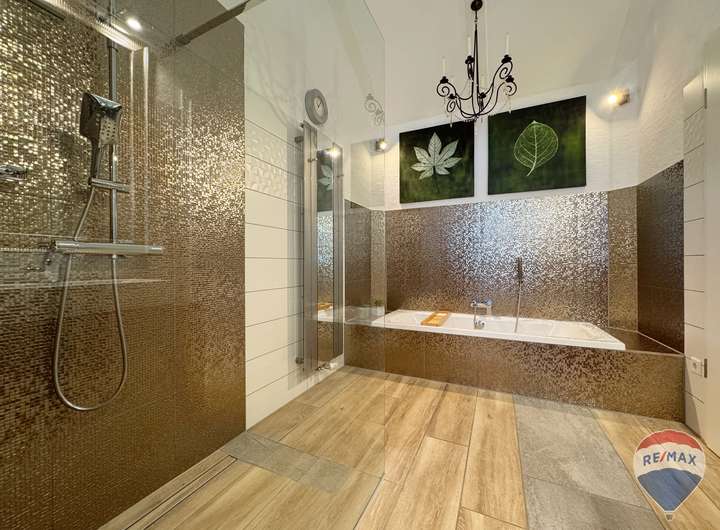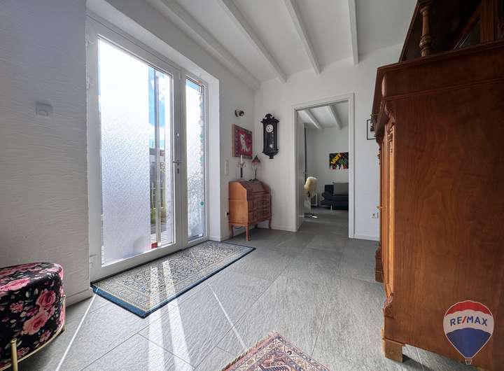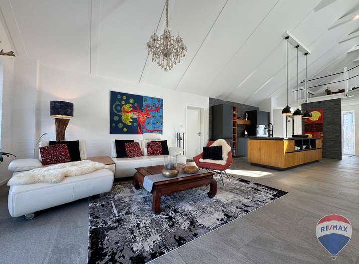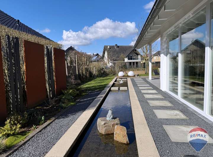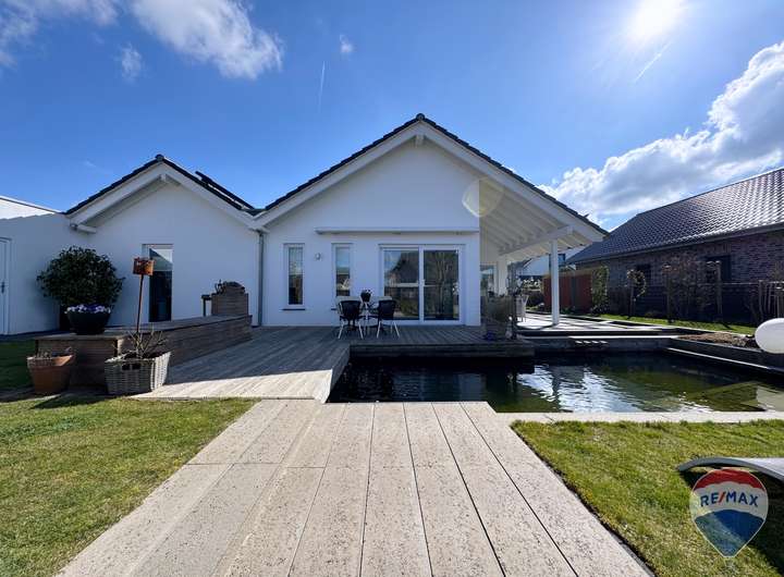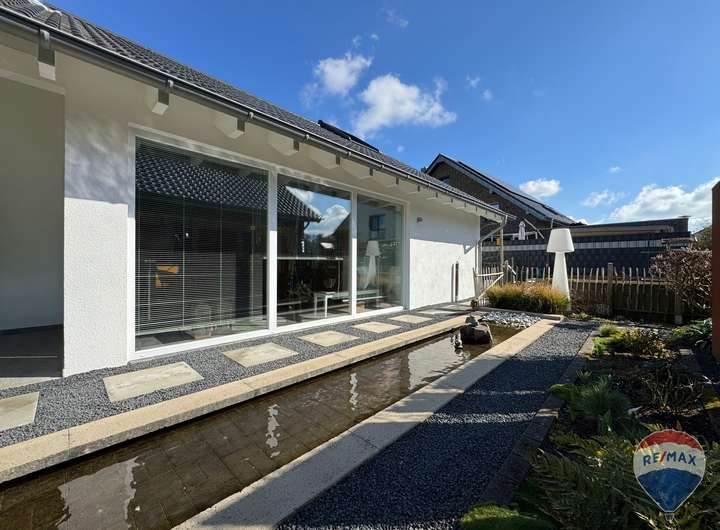 Der Außenbereich überzeugt mit einer liebevoll angelegten Gartenlandschaft und exklusiver Teichanlage. Eine überdachte Terrasse mit Heizstrahler sowie eine Lärchenholzterrasse mit elektrischer Markise bieten perfekte Rückzugsorte für entspannte Stunden im Freien – bei jedem Wetter.