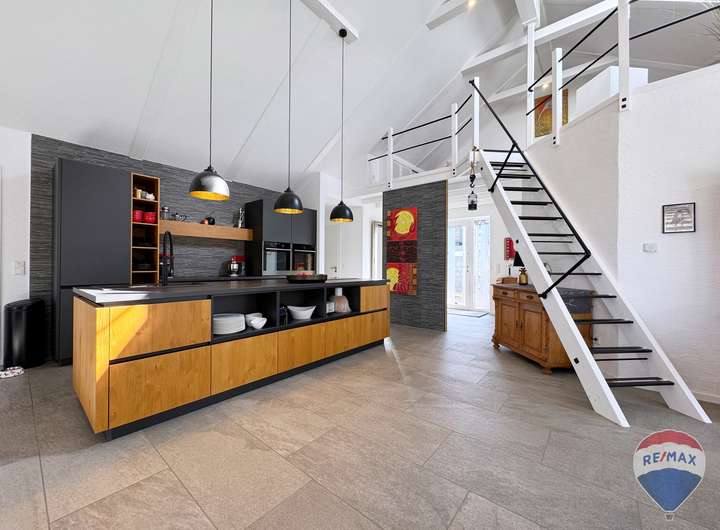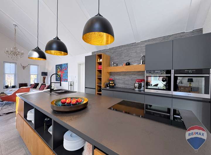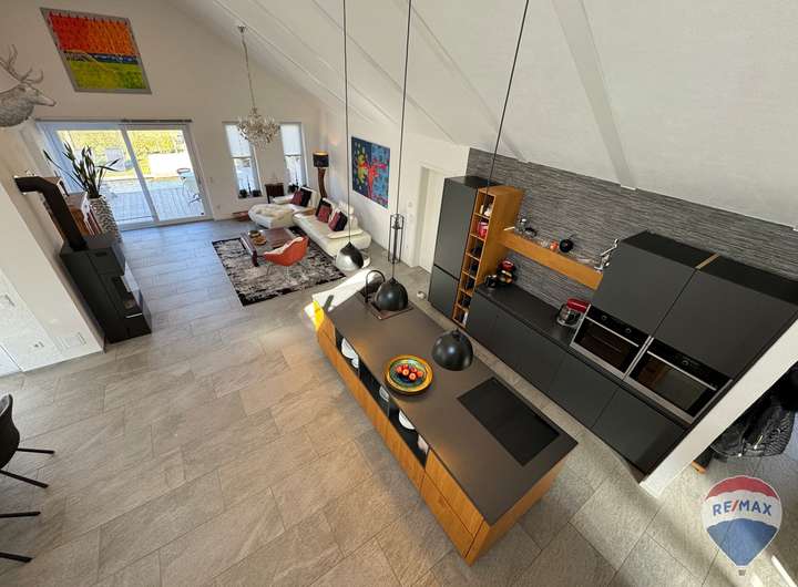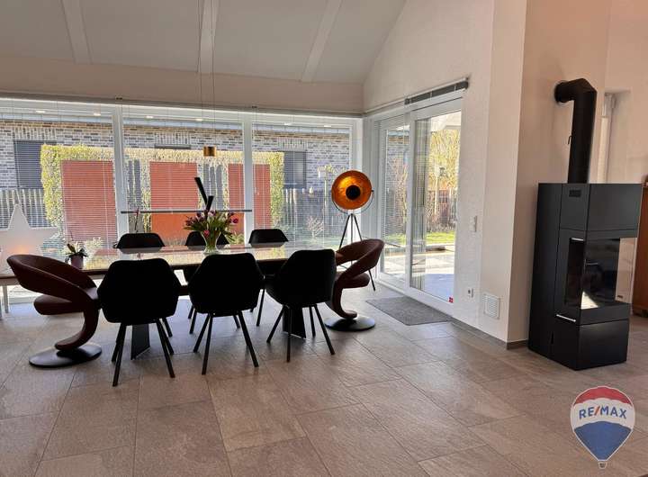 Der lichtdurchflutete Wohn- und Essbereich bildet das Herzstück des Hauses. Hier sorgt ein hochwertiger Kaminofen für wohlige Wärme und eine behagliche Atmosphäre. Die im Kaufpreis enthaltene, exklusive Einbauküche lässt keine Wünsche offen und lädt zum gemeinsamen Kochen und Genießen ein.