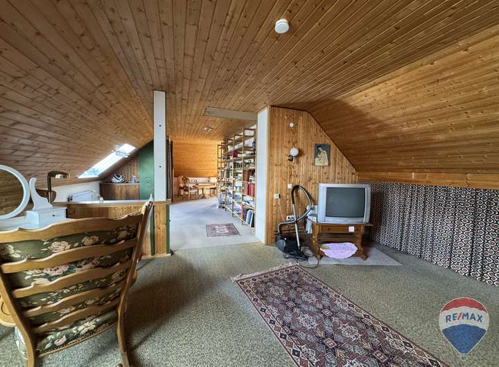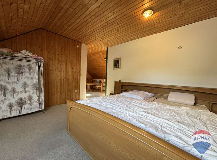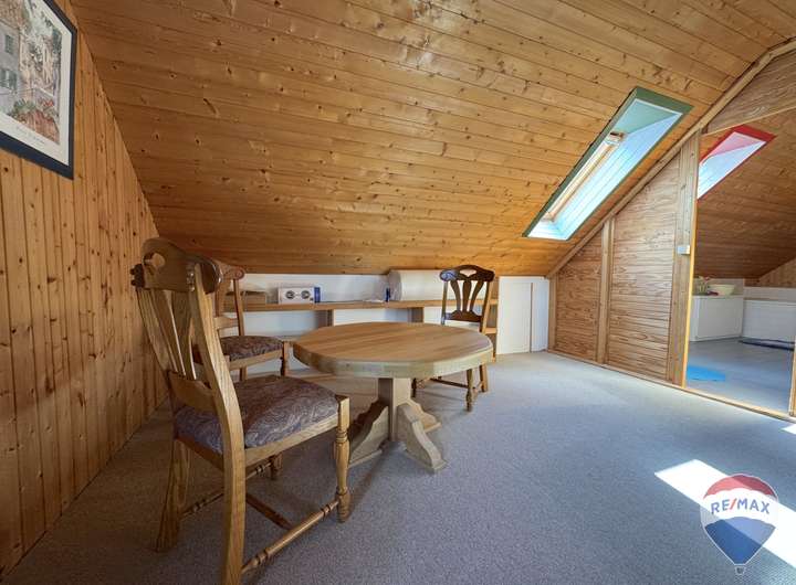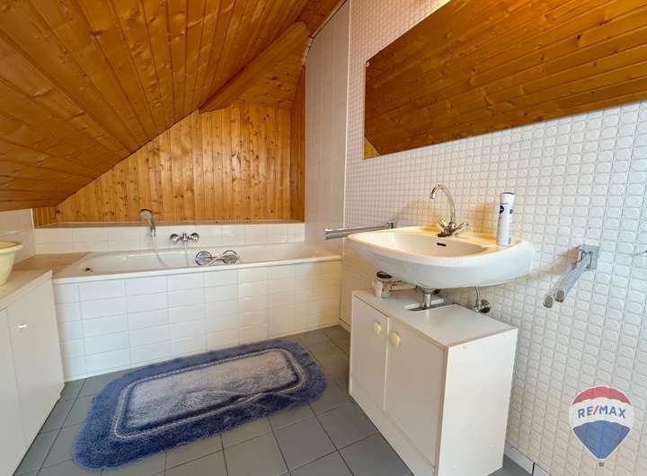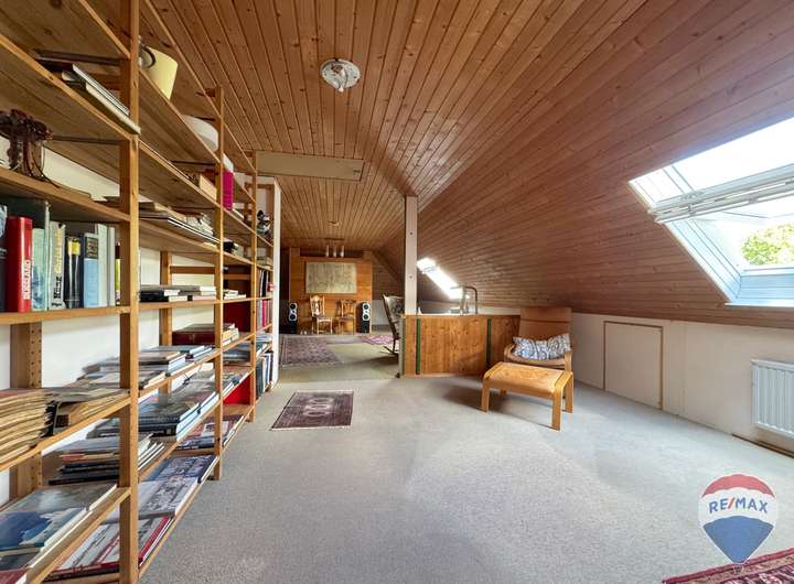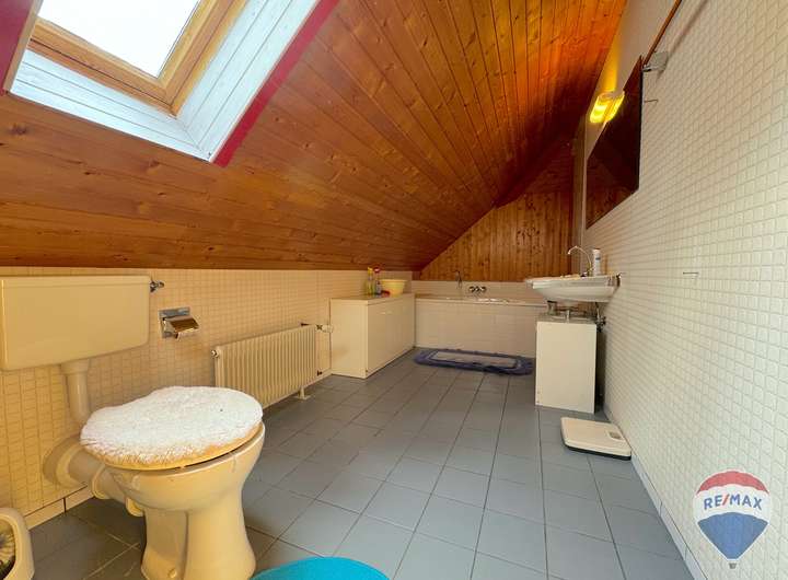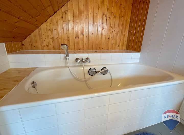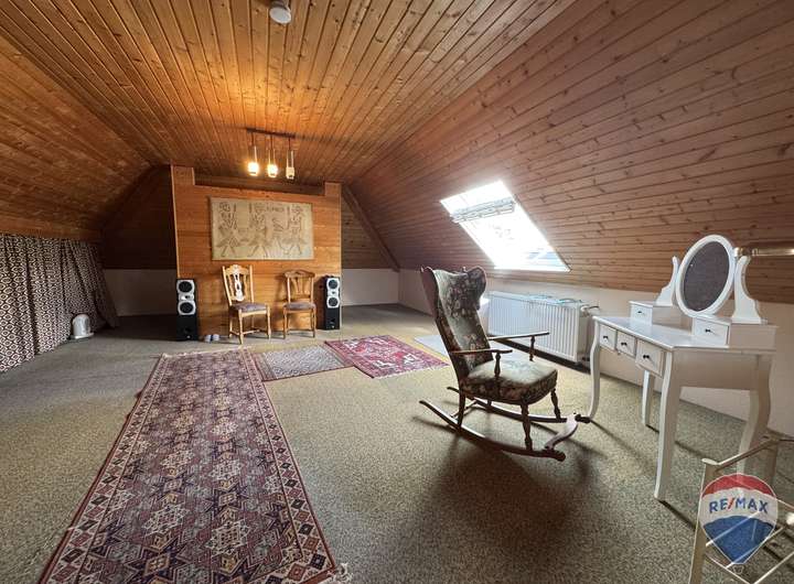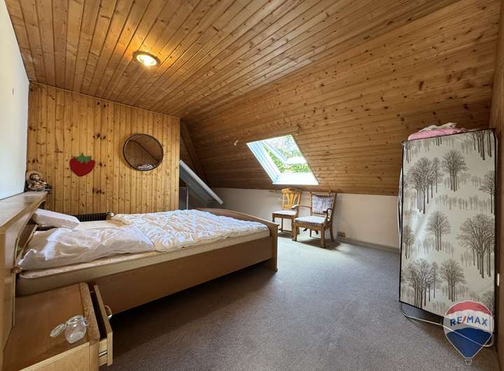 Im Dachgeschoss befindet sich ein weiteres, besonders großes Zimmer, das vielfältige Nutzungsmöglichkeiten eröffnet – sei es als Elternschlafzimmer, Kinderparadies oder Hobbyraum. Ergänzt wird diese Etage durch ein komfortables Badezimmer mit Badewanne, das zum Entspannen einlädt.