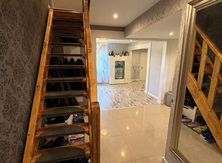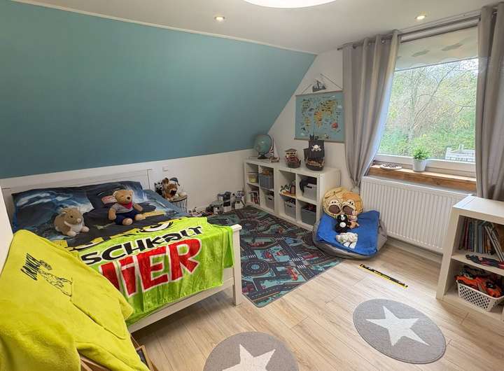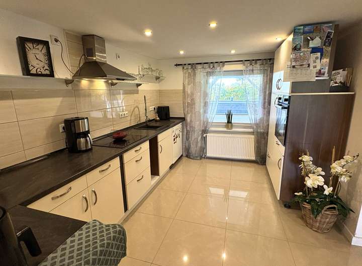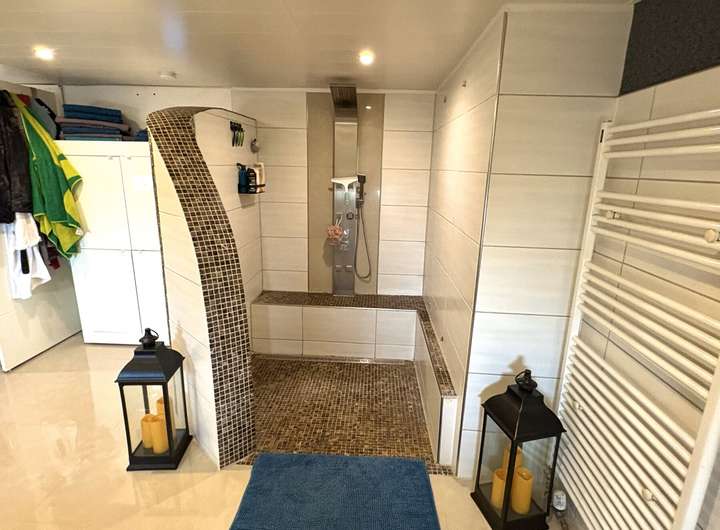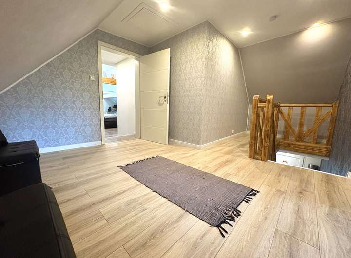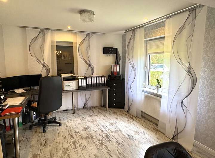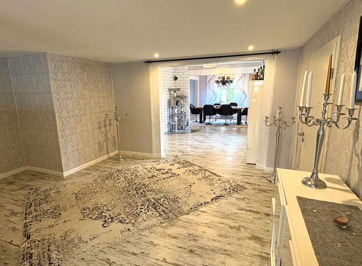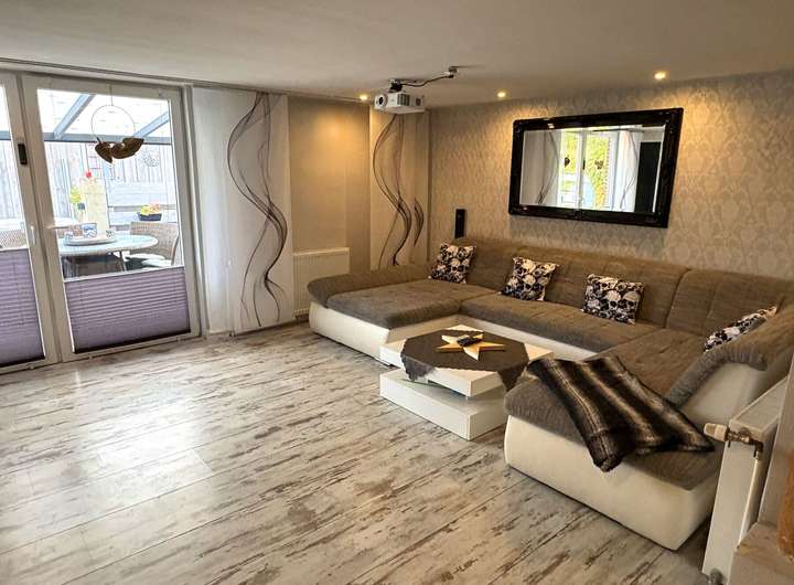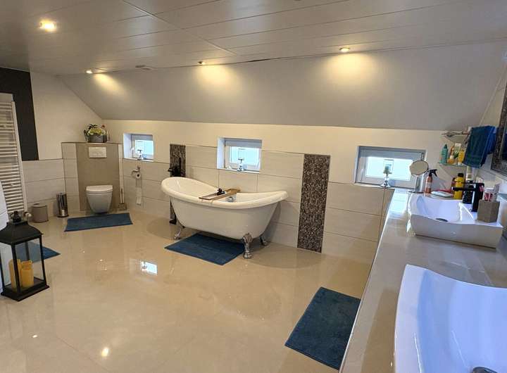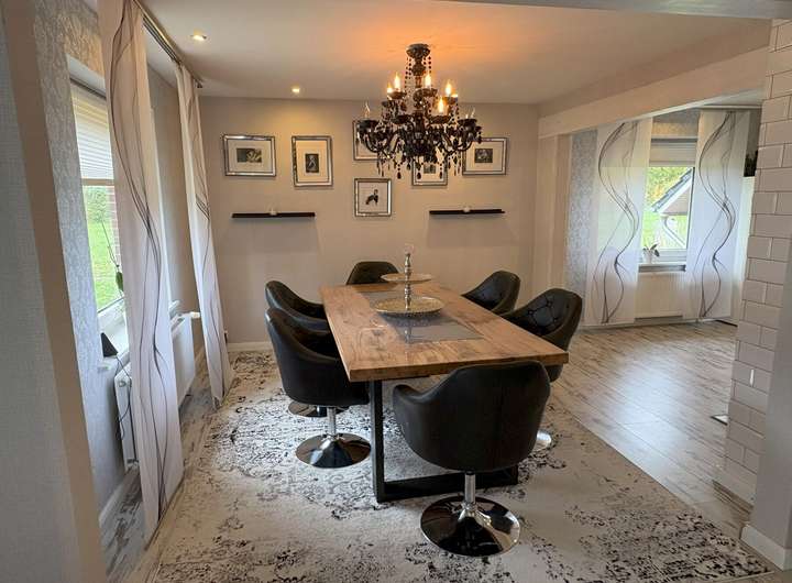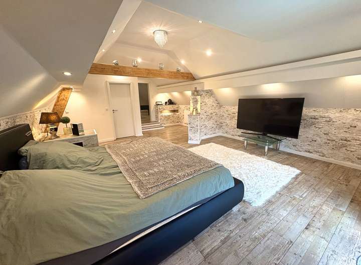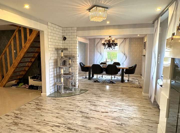 Dieses gepflegte und renovierte Landhaus überzeugt durch seine großzügige Raumaufteilung, liebevolle Details und ein offenes, helles Wohnkonzept. Das Haus bietet insgesamt sieben Zimmer, fünf im Erdgeschoss und zwei im Obergeschoss und begeistert mit einer durchdachten Kombination aus Offenheit und Gestaltungsfreiheit. Im Erdgeschoss gehen Küche, Ess- und Wohnbereiche fließend ineinander über, was ein besonders großzügiges Raumgefühl schafft. Auf Wunsch lassen sich die offenen Räume durch Wände wieder voneinander trennen, um individuelle Raumkonzepte zu realisieren. Das Vollbad im Erdgeschoss verfügt über Fußbodenheizung, eine Badewanne und eine ebenerdige Dusche und ist, wie das gesamte Haus, mit stimmungsvoller Beleuchtung ausgestattet. Der Wohnbereich lädt zum Entspannen ein und bietet direkten Zugang zur Terrasse. Im Obergeschoss befinden sich ein großes Elternschlafzimmer mit sichtbaren Holzbalken sowie ein Kinder- oder Arbeitszimmer. Das zusätzliche angrenzende Zimmer kann als Ankleidezimmer oder zweites Bad ausgebaut werden.