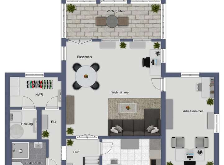 Ein separates Arbeitszimmer bietet ideale Voraussetzungen für Homeoffice oder kreative Tätigkeiten. Ergänzt wird das EG durch einen Abstellraum mit WM-Anschluss sowie ein modernes Duschbad mit Fenster.